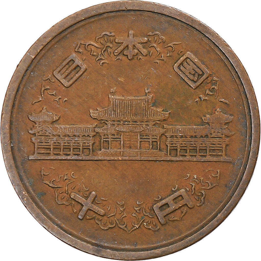 On the obverse side of the coin, one typically finds the denomination "10" accompanied by the Japanese character for "Yen," all inscribed within a decorative border. The design may also feature the depiction of a young rice plant, symbolizing agricultural prosperity and abundance, which has been an essential aspect of Japan's economy and culture throughout its history.